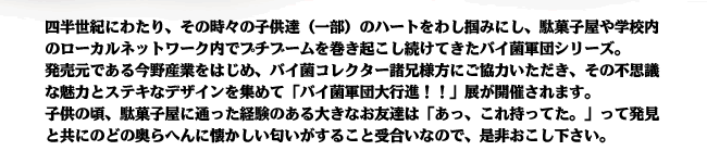 会場では、オリジナルシリーズや貴重な資料、当時の原型(木型)のほか、バイ菌軍団に感染経験のあるクリエイター達のイラストなどを展示します。